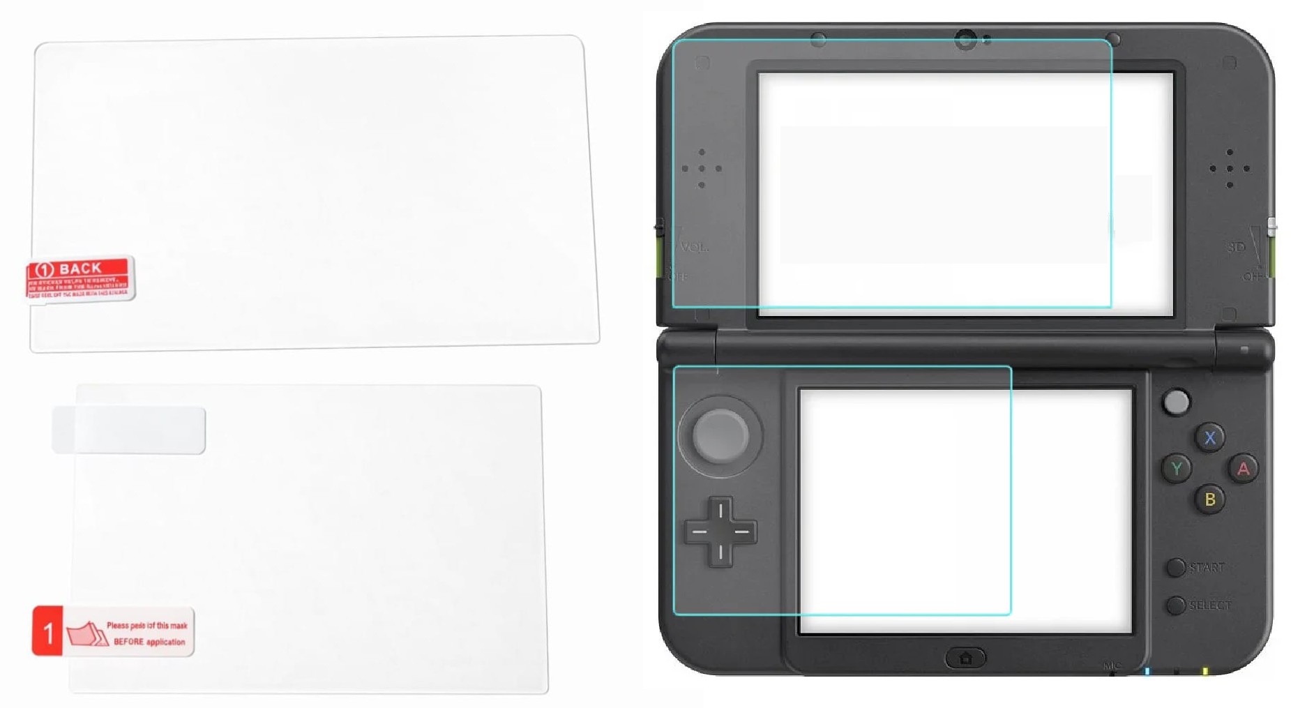 Kit de películas protetoras desenvolvido especialmente para Nintendo 3DS XL e New Nintendo 3DS XL, oferecendo proteção completa para as duas telas do console.